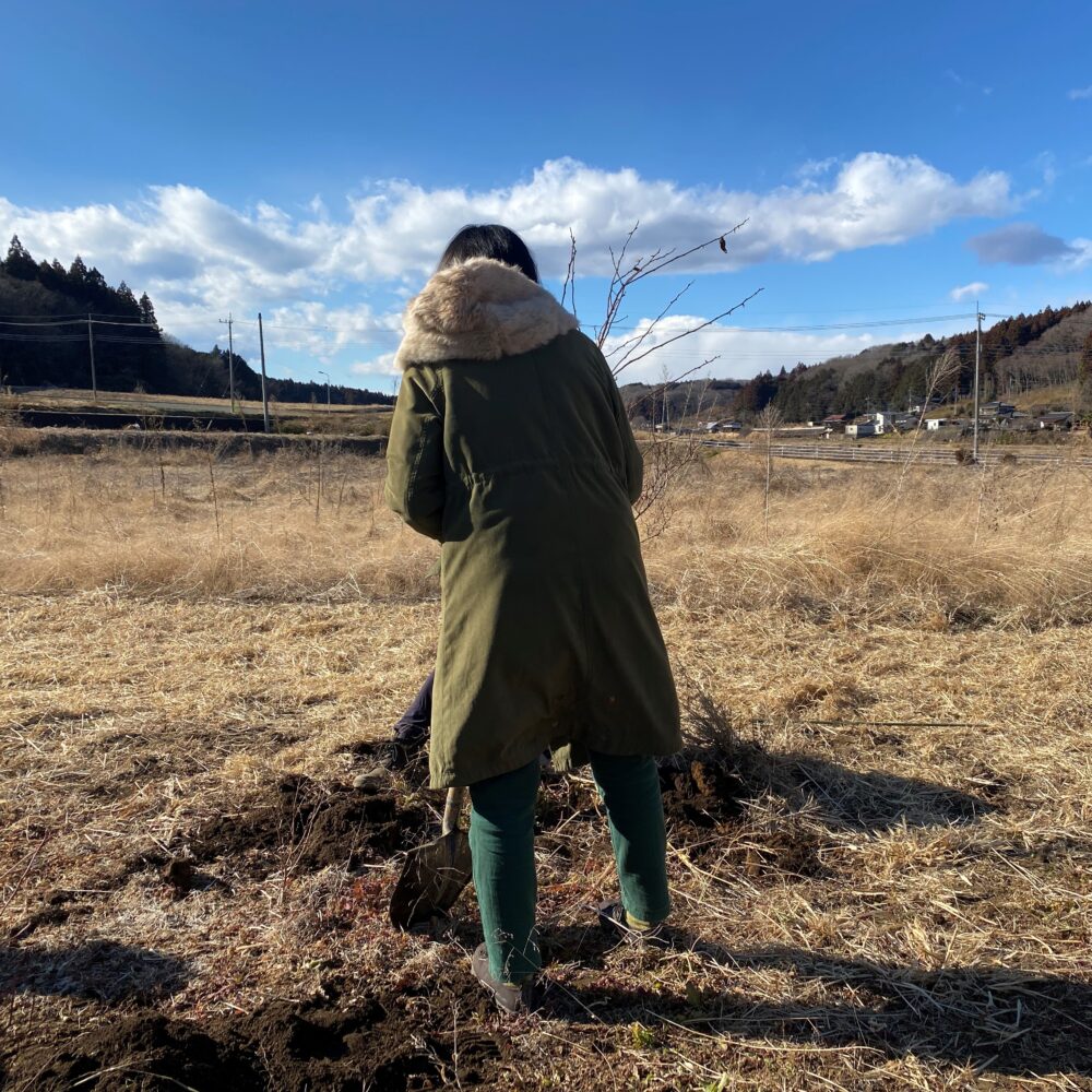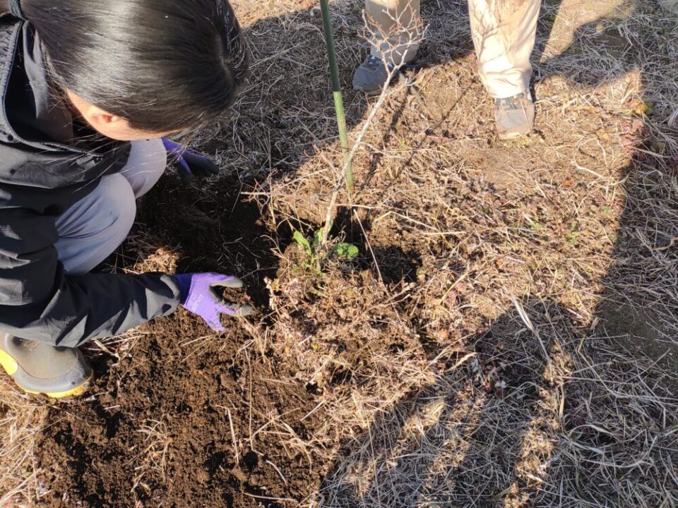 根っこが完全に埋まるよう、60cmの深さに穴を掘ります。深く掘るほどが土が固く、しかもスコップに力を入れづらくなるので、なかなか大変です。穴を掘り終わったあとで、位置がずれていたことが発覚するハプニングもありました笑。