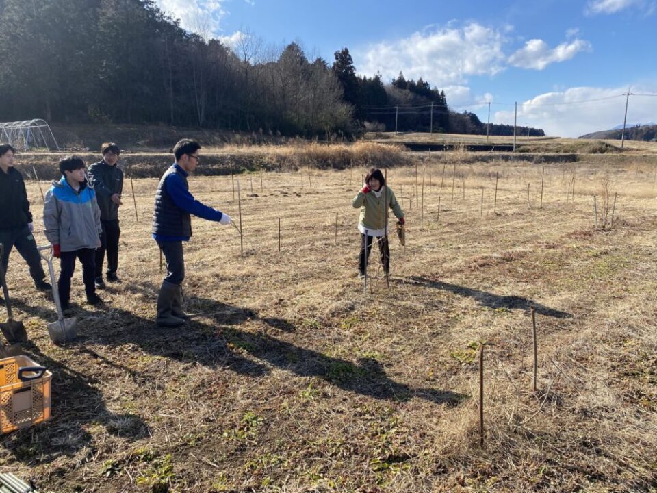 始めに移植先の畑にスコップで穴を掘りました。雑草を刈るときにブルーベリーを一緒に刈ってしまうことのないように、なるべく真っ直ぐ一列に掘る必要があるとのことで、メジャーを使って2m間隔で支柱を立て、それを目安にして掘りました。