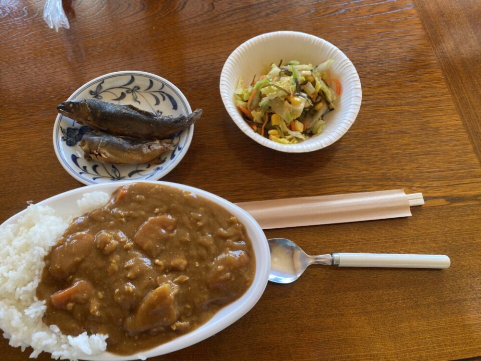 お昼は、なかがわ里山元気倶楽部のみなさまが用意してくださったカレーと、倶楽部で育てた白菜のサラダ、そして鮎の甘露煮をいただきました。どれもとても美味しく、おなかいっぱい食べたことで午後の作業へのよい活力になりました。