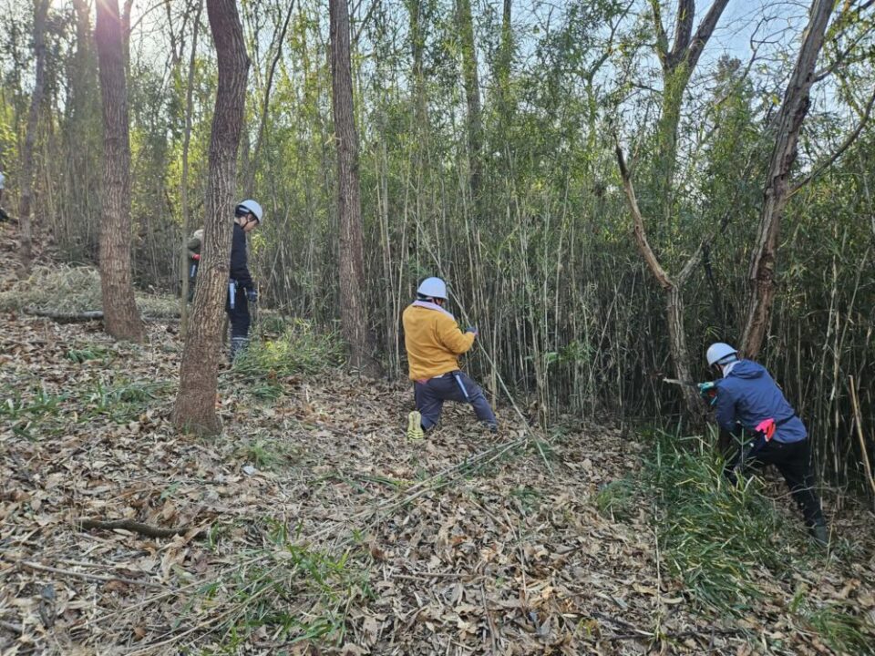 篠竹をノコギリで切って運ぶ作業です。細い竹なので初めての方でも安心して取り組めます。