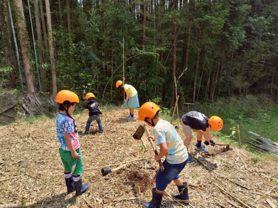 前回子どもたちと篠竹を刈った場所に、地域の方と一緒に果樹と桜の苗木の植えつけを行います。