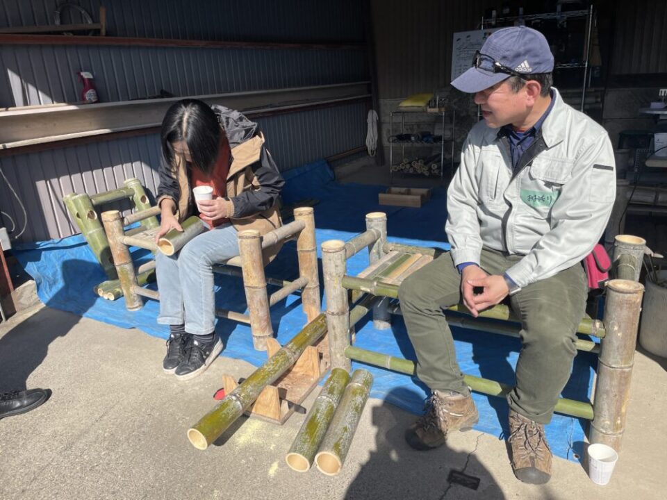 まずはサンプルの竹ベンチに座って、お茶を飲みながらブレイクタイムでスタート。