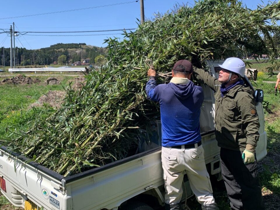 竹穂がまとまったら、軽トラックに積み込み、運搬中に落下しないよう荷台にロープで固定し、元気ハウスまで運びました。🚚