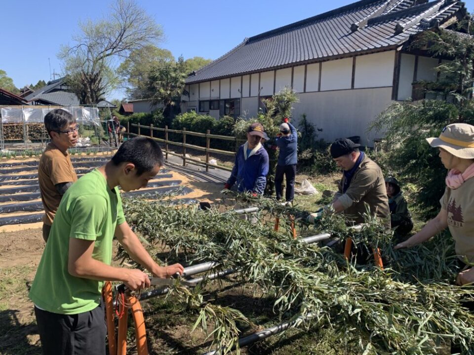 午後の作業は、参加者全員で協力しながら進めました。まずは竹穂の高さをそろえるため、160cmになるように一本ずつ切りそろえていきます🪚
