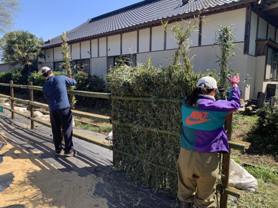 高さが整った竹穂を竹垣の隙間に順番に入れ込んでいきました。同じ長さの竹穂が並ぶことで、竹垣全体の見た目もぐっと引き締まり、仕上がりが整っていきます❗
