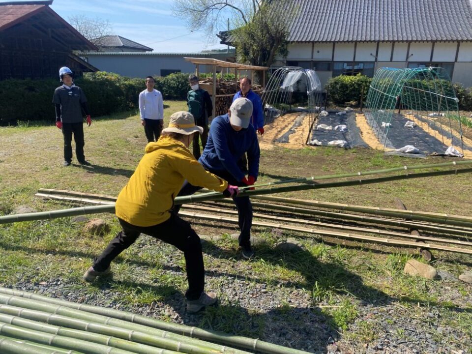 まず高さを決め、その位置に竹を固定します。作業は3人1組で行い、1人がひもを結ぶ係、残りの2人が竹をしっかり支える役割を担当しました。