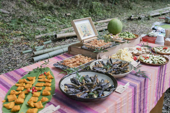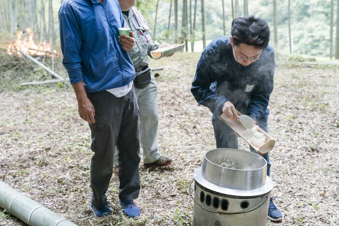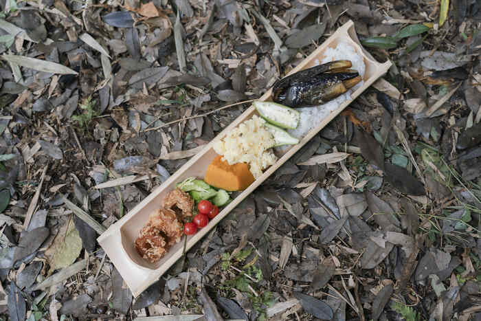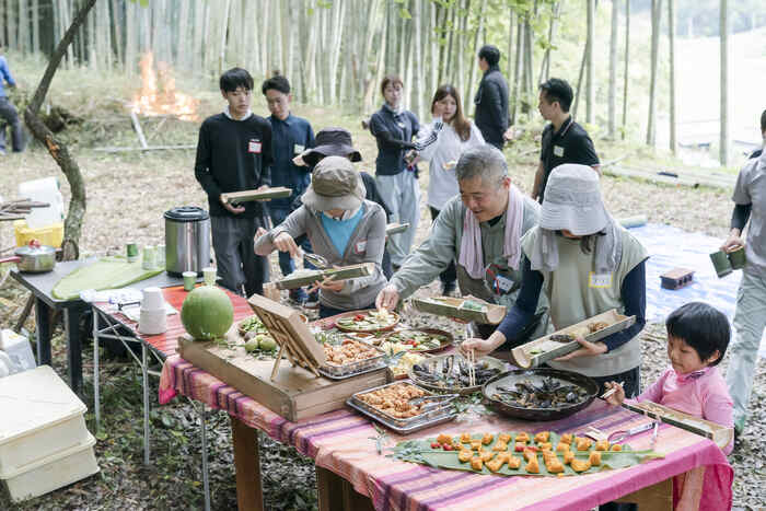 本日は、竹林の中、釜戸で贅沢にご飯を炊き、『ナチュラルフード森の扉』さんのお洒落なケータリングランチをいただきます。