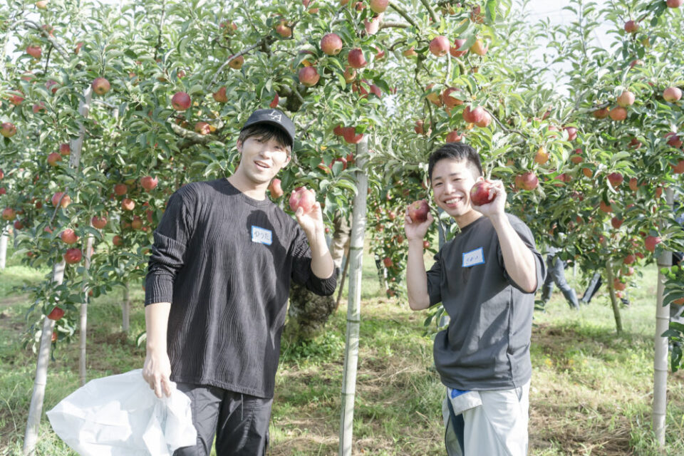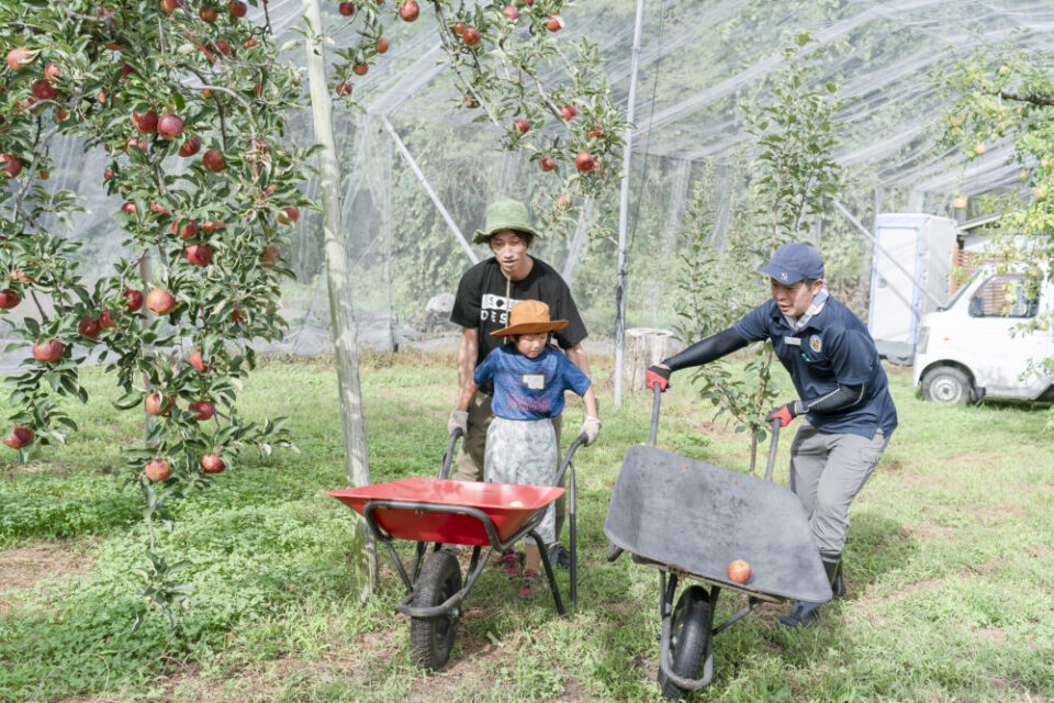 地面に落ちたりんごの回収や、園内に続く道の落ち葉掃きなどの作業を行いました。