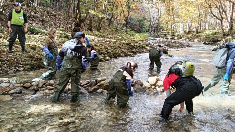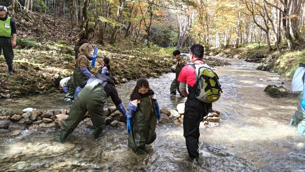 男鹿川の上流に向かって歩いていきます。熊の生息域でもあるので、途中、爆竹や電子ホイッスルを使い、熊に人がいることを知らせつつ、活動現場に到着しました。