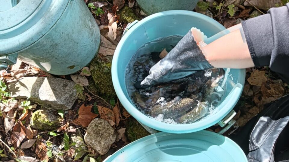 バーブ工を作り終えると、漁協が用意し、地元で育てた魚の放流を行いました。流れを受け進む魚もいれば、淀みでゆっくりしている魚もいれ、参加者が作った新たな川の環境に魚たちも嬉しそうにしているように感じました。