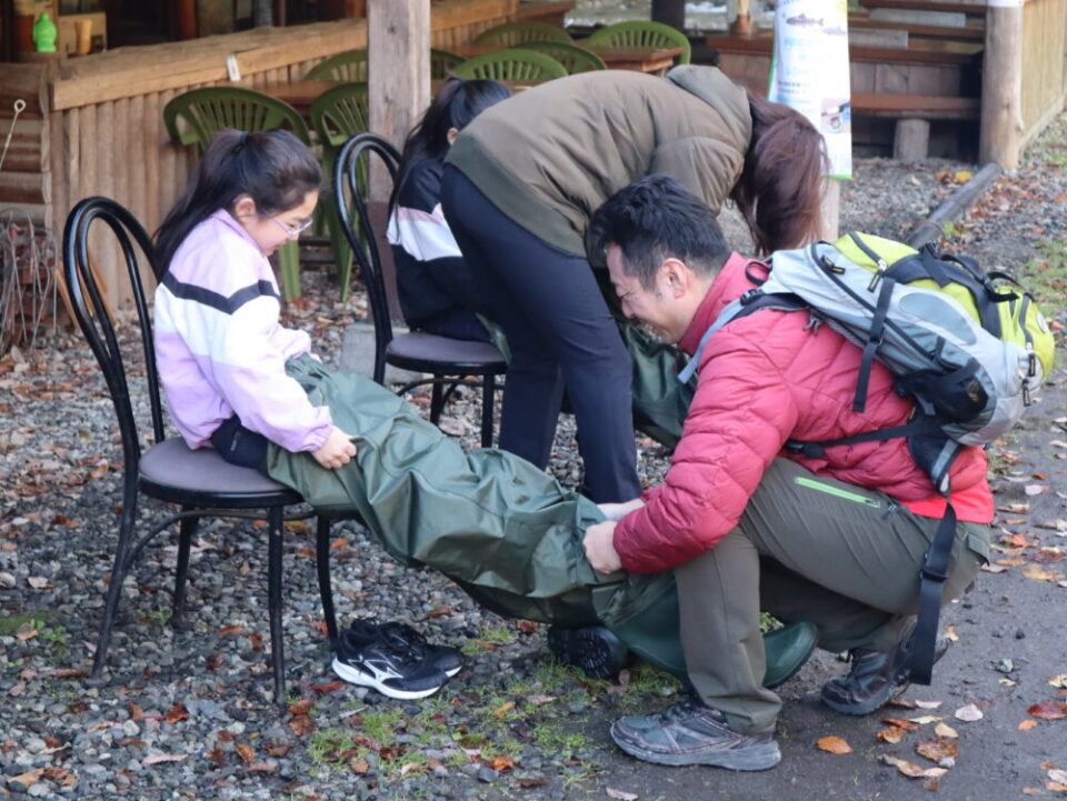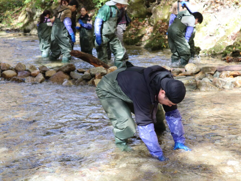 まず活動に入る前に、三依地区の現状や漁協の活動などを説明いただいた後、活動の予定と注意事項を確認し、川に入る準備を行いました。
