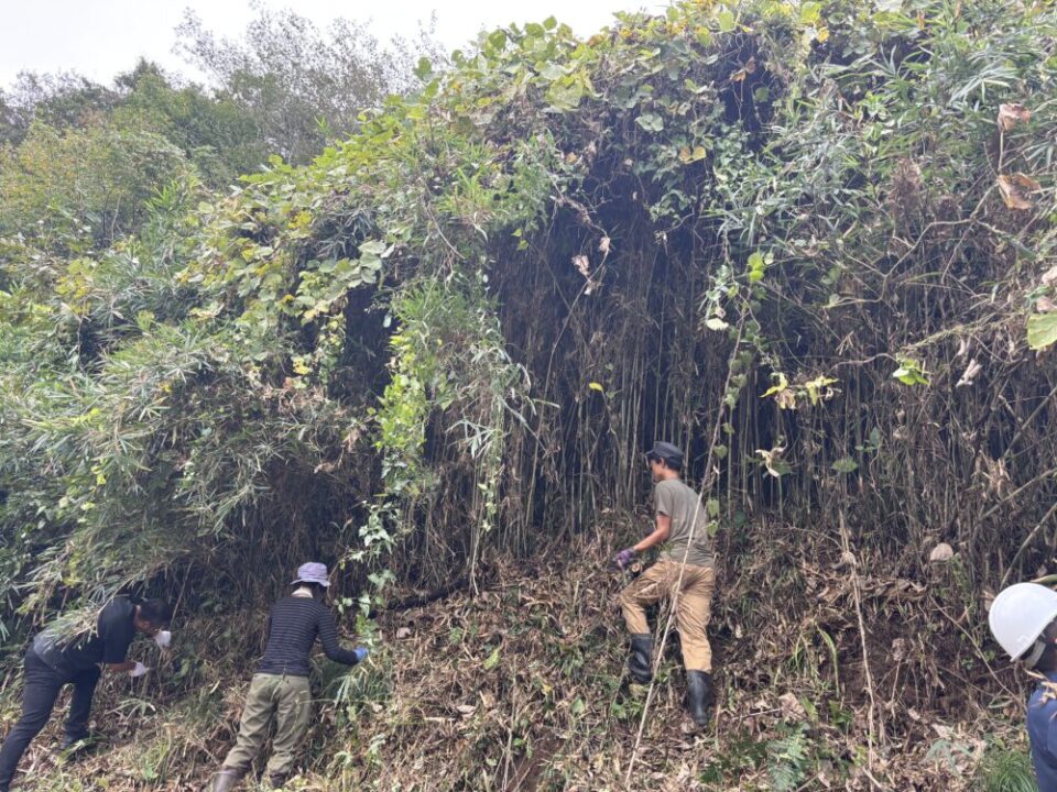 しの竹をノコギリで切って運ぶ作業です。細い竹なので初めての方でも安心して取り組めますし、切った竹を運ぶ作業は子どもでもできます。