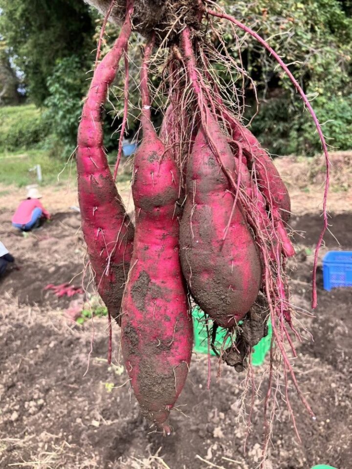地面から出ているツルを引っ張ると、鮮やかな紫色のサツマイモの姿を確認できました。様々なサイズのサツマイモを収穫でき、大根ほどの大きさのものもありました。参加者の皆さんで和気あいあいと楽しくお芋を掘れました。