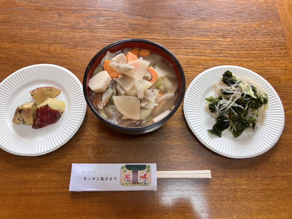 元気倶楽部の皆さんがけんちんうどんと大学芋、サラダを作ってくださいました。参加者の皆さんと協力して、調理や皿への盛り付けを行いました。