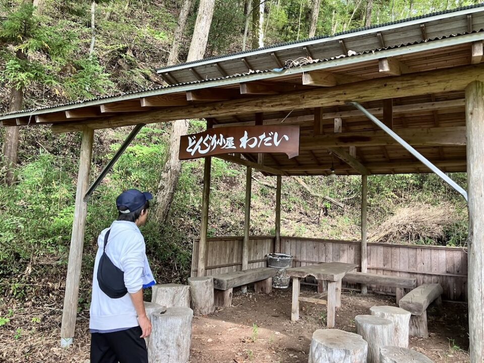 昼食を終えると、車で移動して里山「久那瀬の森」という場所に行きました。そこには、ベンチや切り株でつくられた椅子がおいてあり、一休みできるようになっていました。