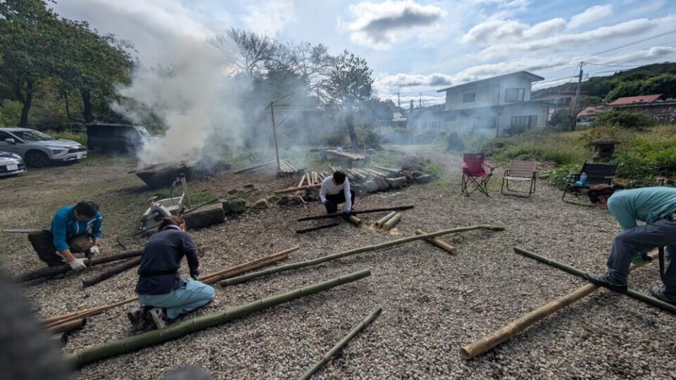 竹を置く際には、向きをそろえる必要があります。そろえておくことで、竹の節と節の間の空気が暴発した時の危険性が下がります。空気が暴発した時は「ボンッ‼」と大きな音が鳴るため、作業をしている私含め、一緒に作業していた方々も「おぉ~」と感嘆の声をこぼしていました。