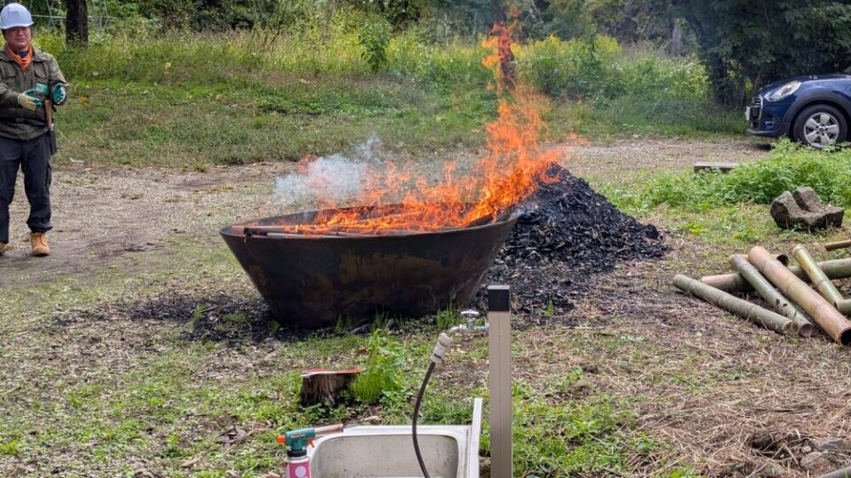 炭化器に竹を置く際に煙が目に入ることもあります。熱と煙とたたかいながら竹を置くというのはなかなかしない体験です。