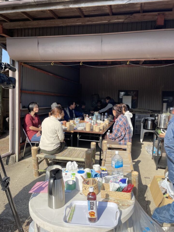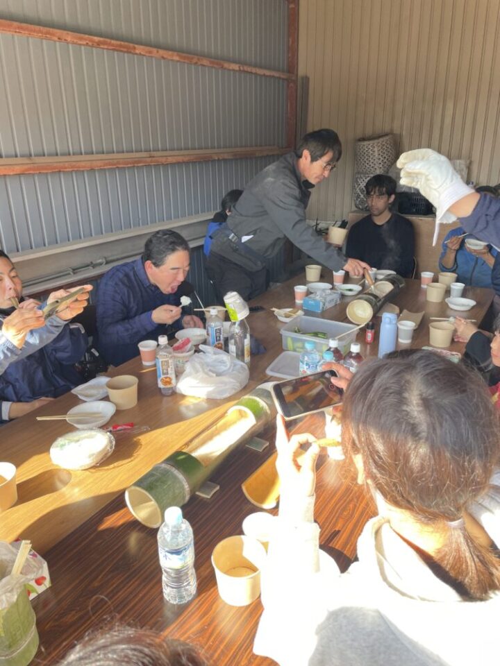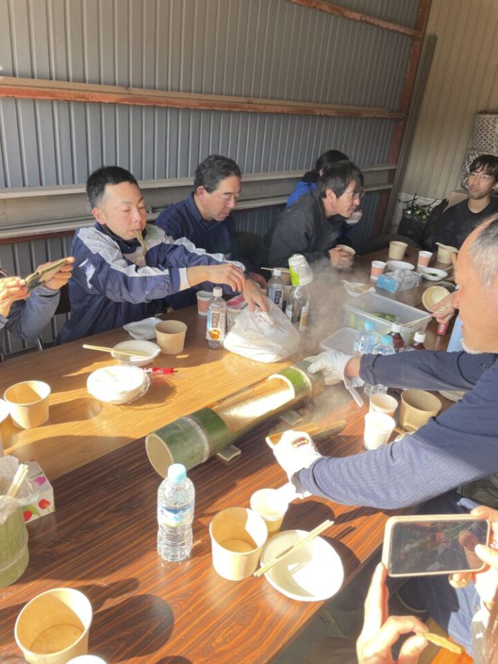 お昼は、山の恵みを味わっていただくため、しし汁と竹で炊いたご飯を皆さんで囲みました。