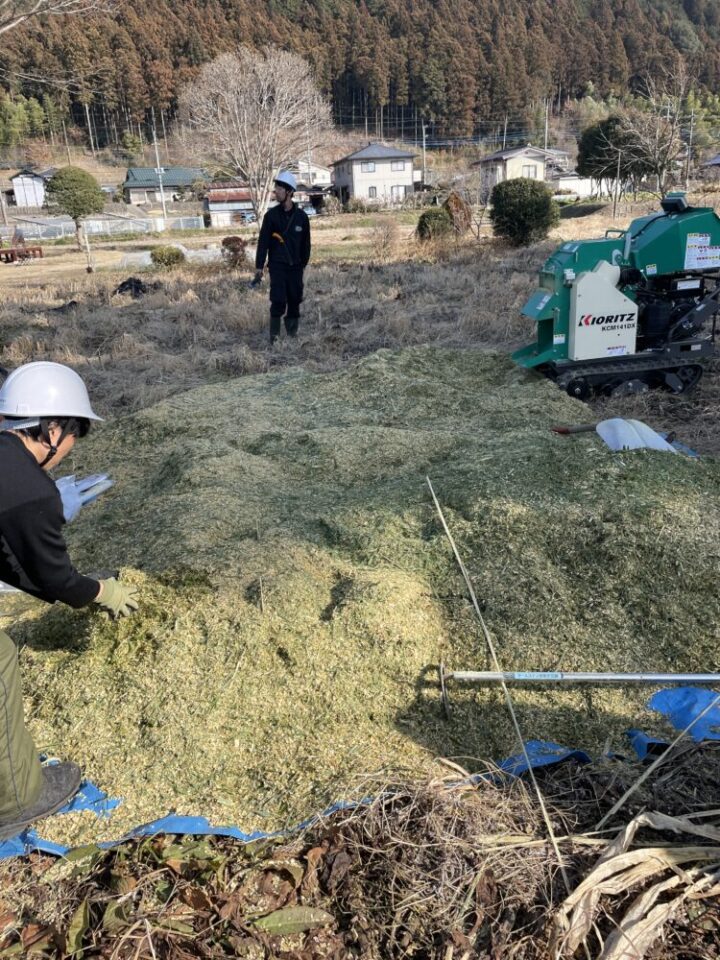 午後は、午前中にシートに山盛りにできた竹チップの袋詰め作業と、午前中に引き続き竹の伐採作業を行いました。